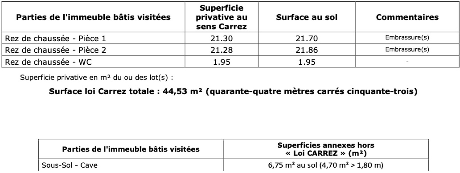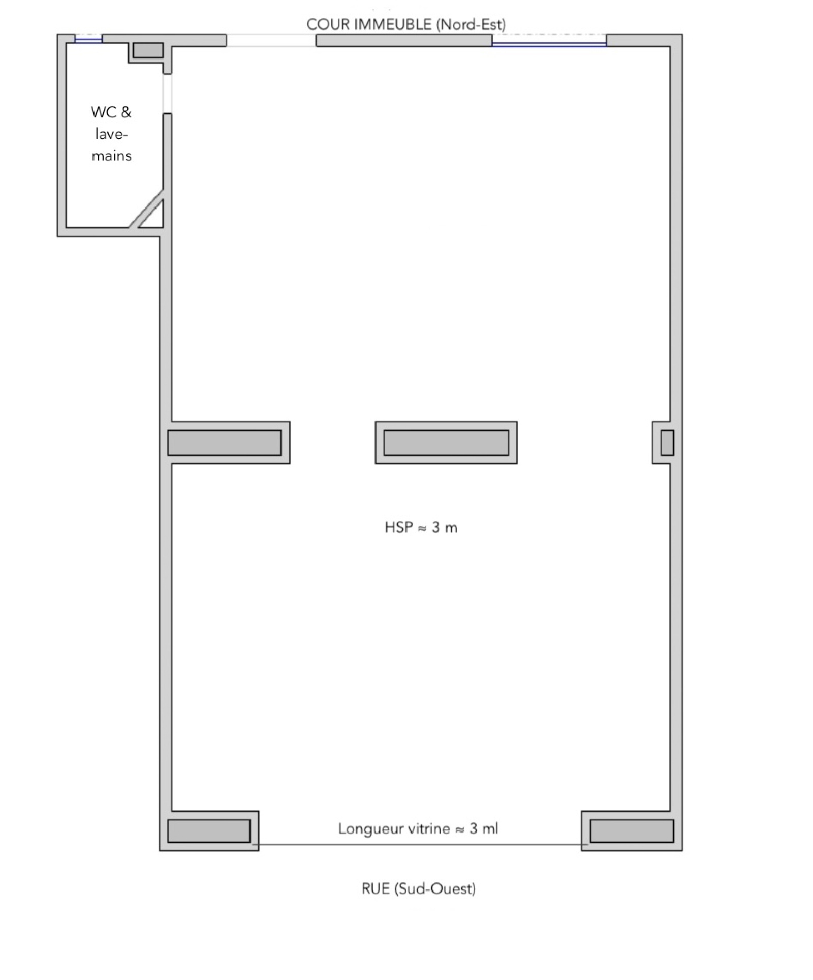 Hauteur sous plafond : 2,72 mètres. Façade rue : 3,60 mètres linéaires.