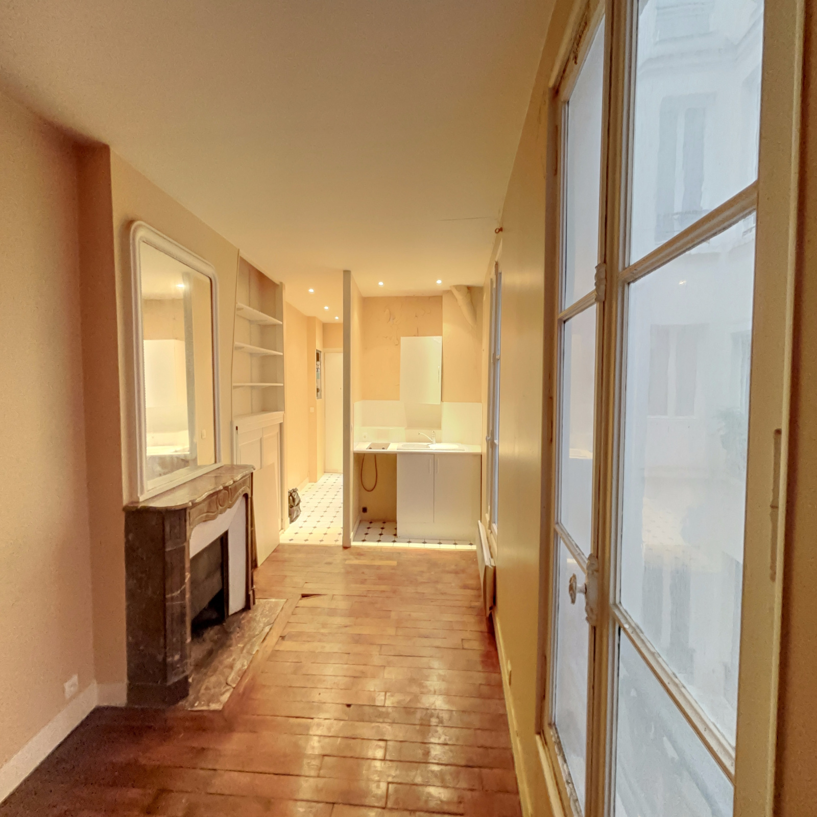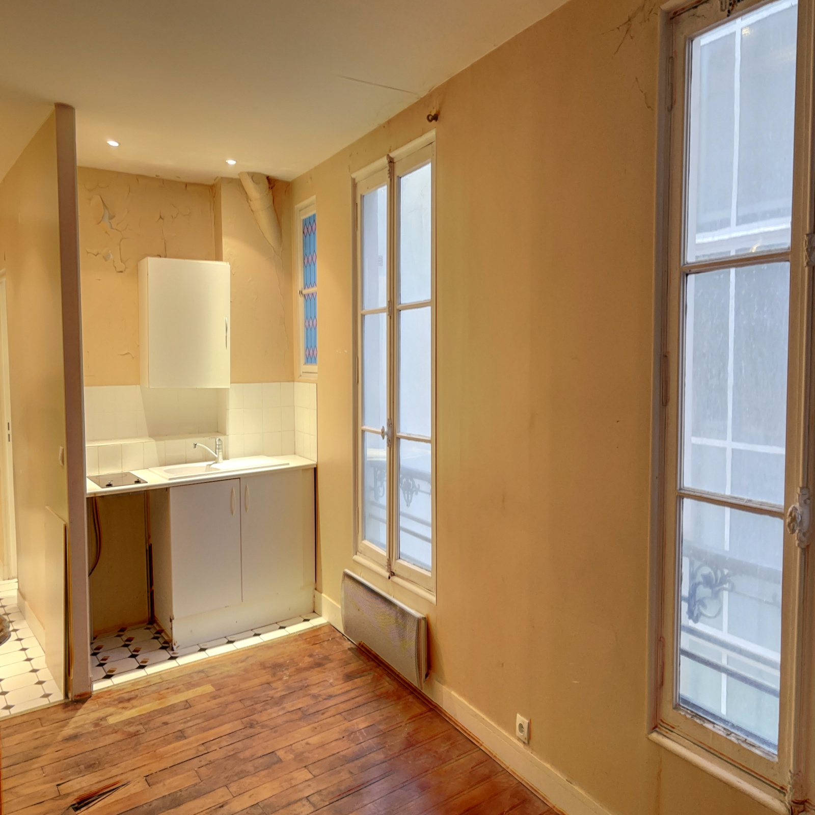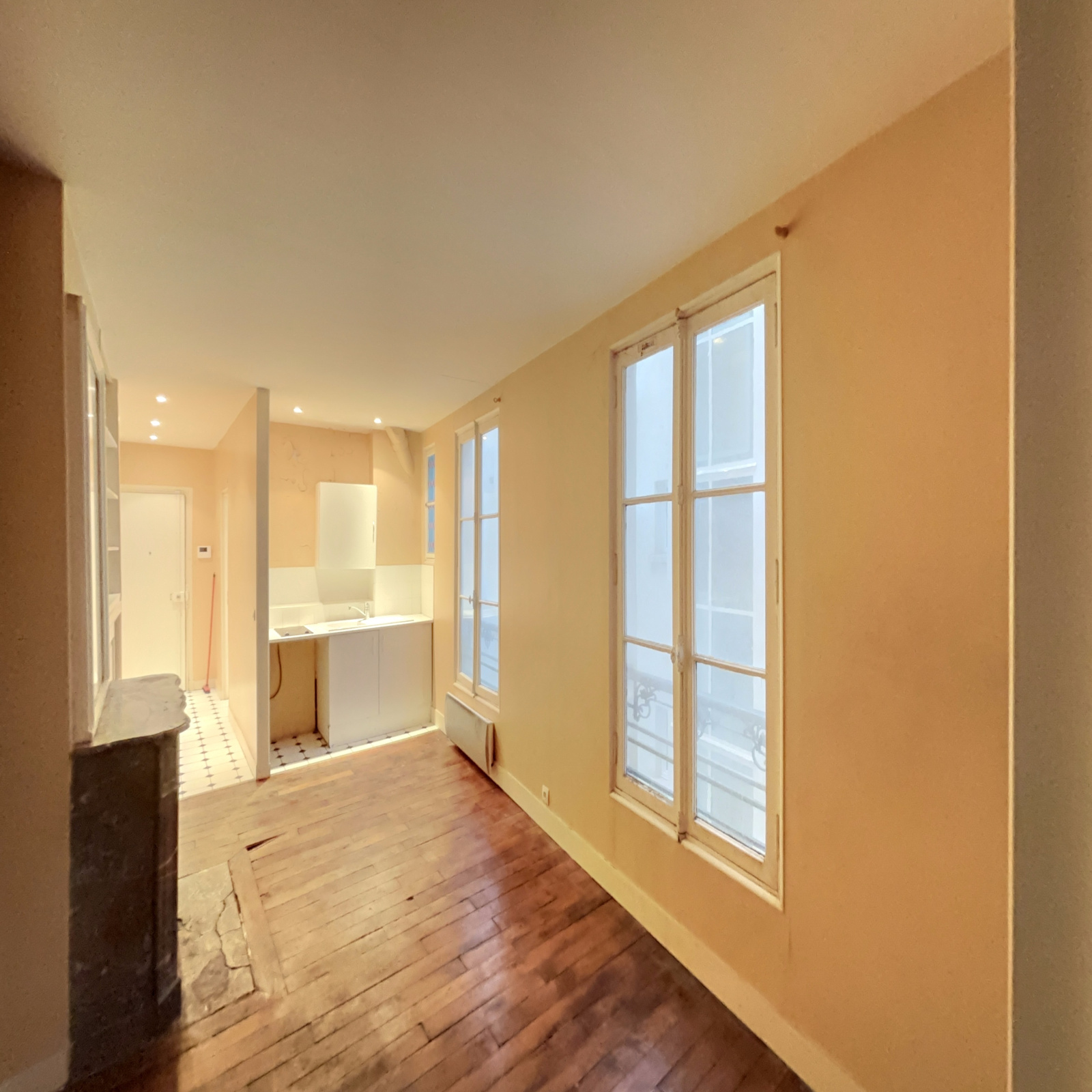 Au 3ème étage par escalier d'un immeuble sur cour datant de 1875, appartement deux pièces à rénover, composé d'une entrée, un séjour avec kitchenette ouverte, une chambre, une salle de bains avec WC.