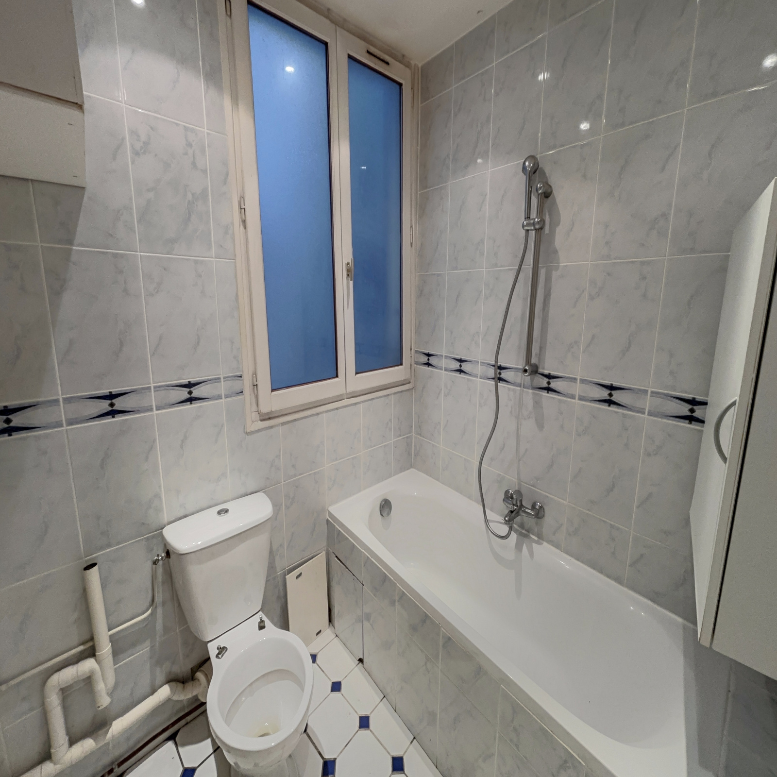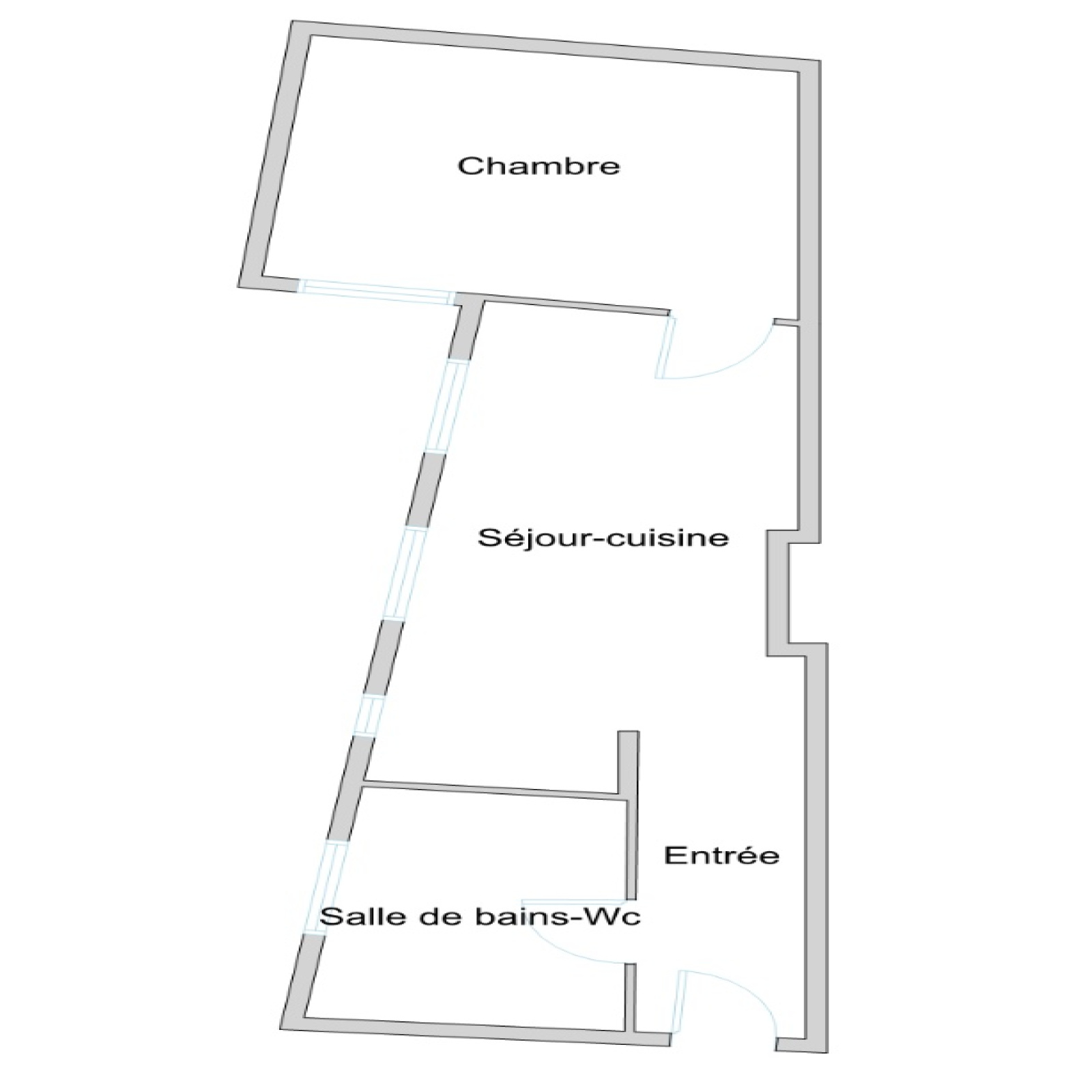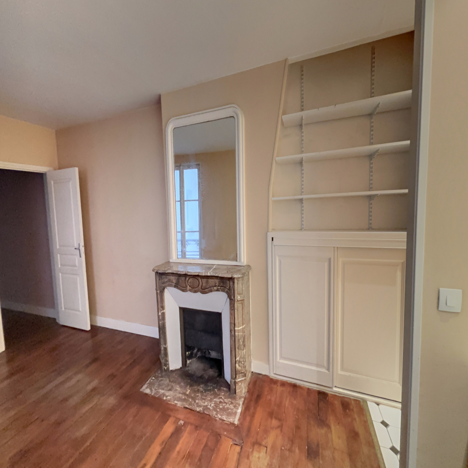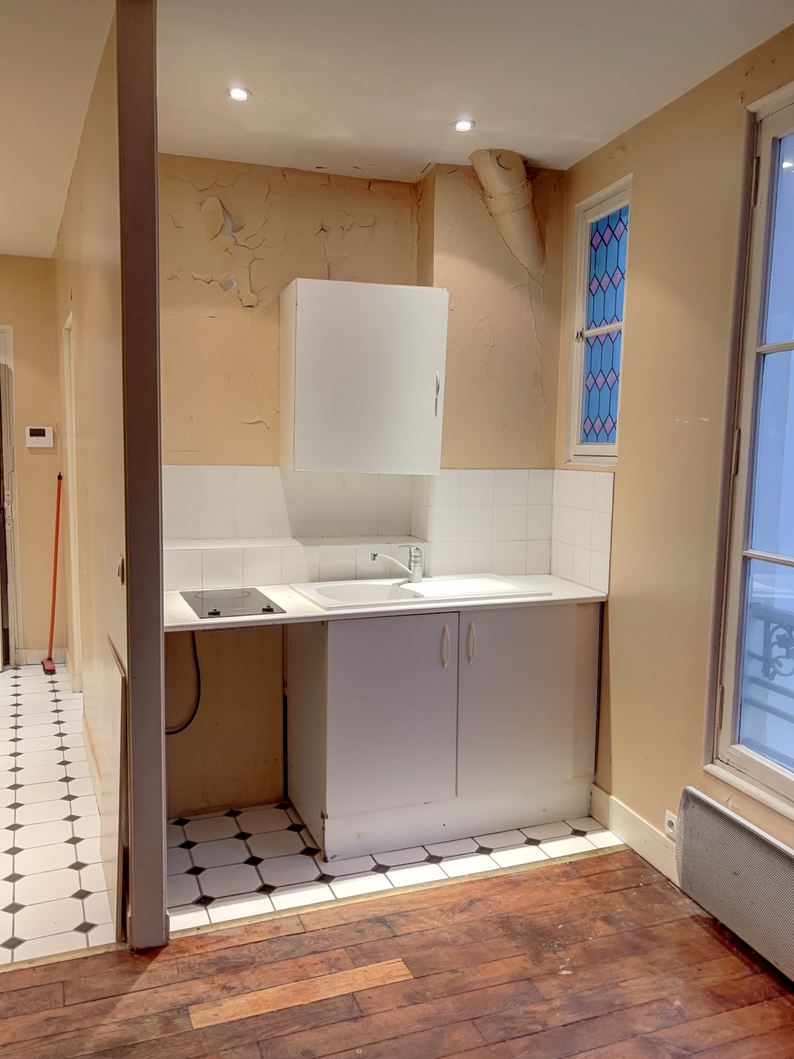 Au 3ème étage par escalier d'un immeuble sur cour datant de 1875, appartement deux pièces à rénover, composé d'une entrée, un séjour avec kitchenette ouverte, une chambre, une salle de bains avec WC.