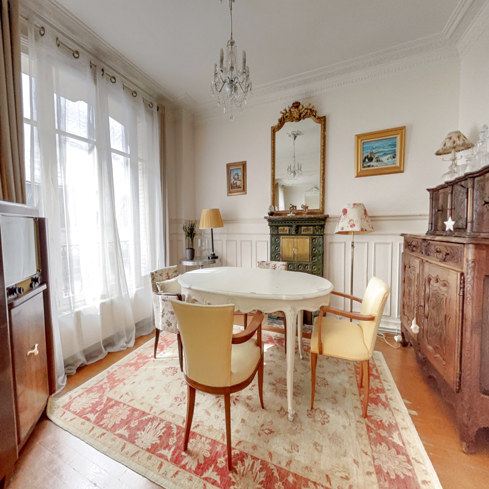 On aime : le charme de l'ancien avec le parquet, les moulures, les 3 cheminées fonctionnelles (conduits vérifiés), le poêle prussien, la belle hauteur sous plafond (2.80 m), la luminosité appréciable de l'appartement, l'ambiance paisible.
